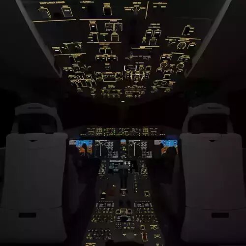 High poly 3D Boeing 787 Flight deck. All buttons, letters, and screws are modeled and placed on their respective real world locations, with dedicated buttons for easy customization, named and organized in collections. Letters are 3D meshes, providing high quality details even in close up shots.